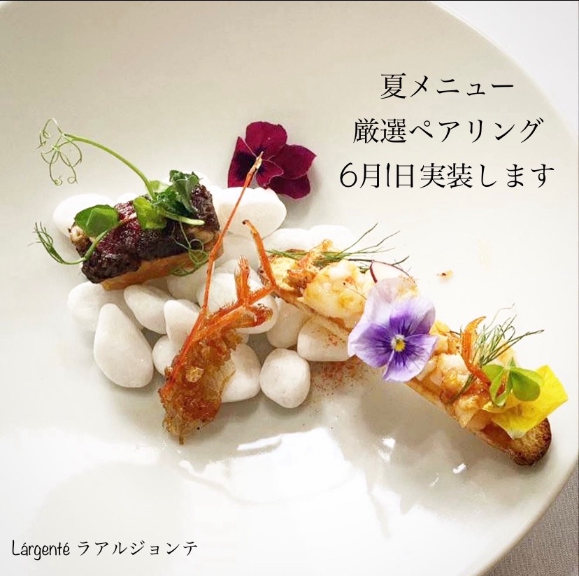 夏の食材を使用した夏限定コースメニューに変わります。記念日やデートに使える【ワイン3杯からのペアリングプラン】もご用意いたしました。