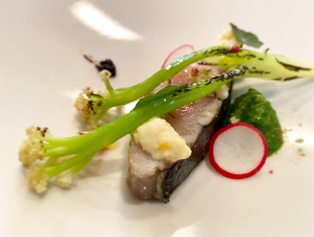燻製した冬鰆のミキュイ/なばな/レモンクーリ/カリフローレ昆布ポシェ/昆布パウダー/オイル/ピンクペッパー/ナスタチウム/ラディッシュ/黒葫