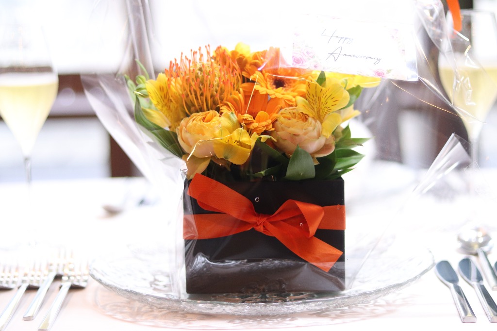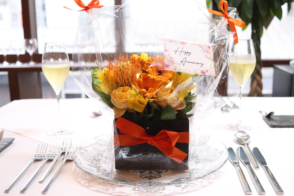 栄駅付近のフランス料理レストラン ラアルジョンテでは通常のコース料理に、メッセージ付きの花束ブーケと乾杯ドリンクが付けられる記念日オプションを、ランチとディナーにて、オプション料金8400円で特別に追加提供しております。